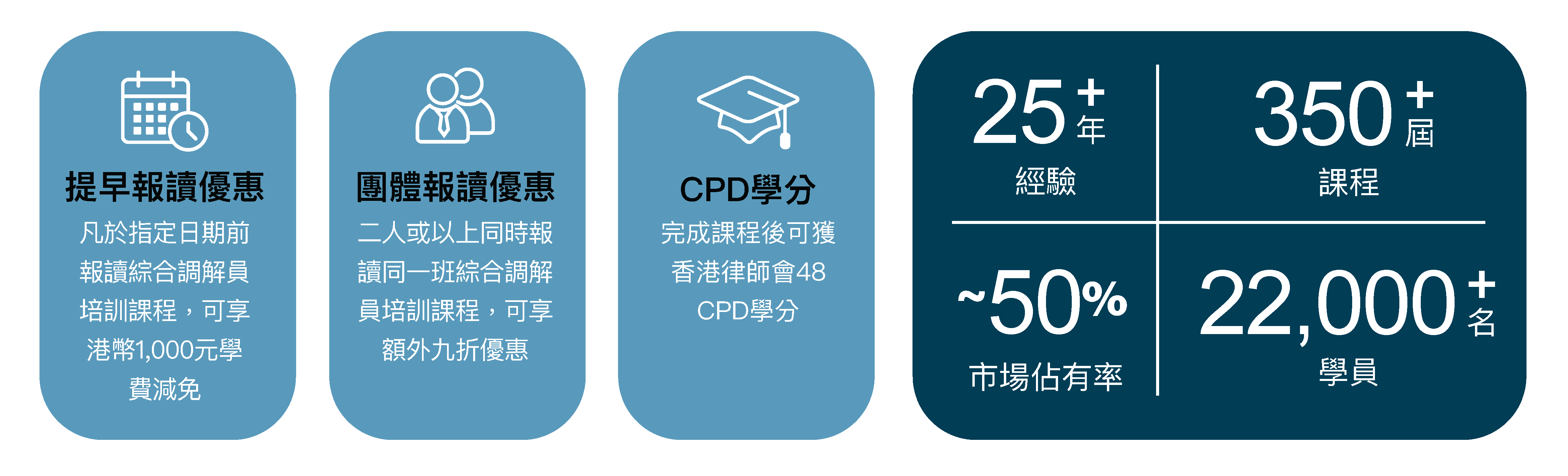 (團體報讀優惠:凡二人或以上同時報讀同一班的綜合調解員培訓課程,每位申請人均可再享額外九折優惠。申請人均須於報名表上列明其他報讀人士姓名及同時遞交申請。)